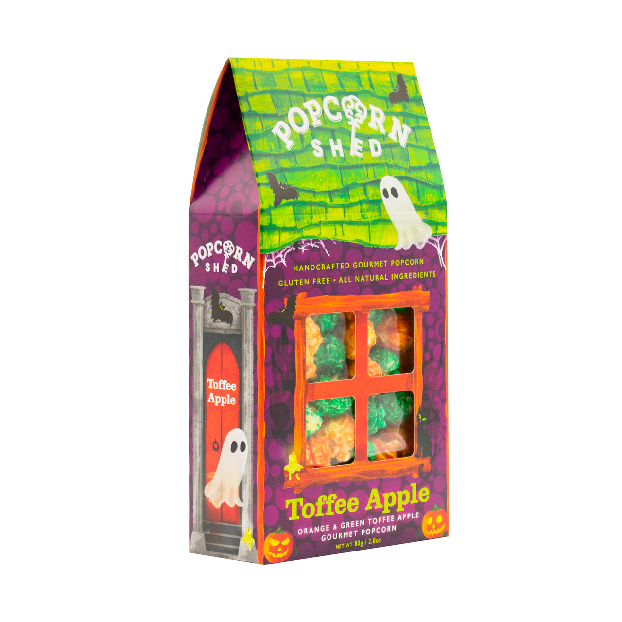 Toffee Apple - A colourful treat for Halloween. Orange and green toffee apple flavoured popcorn, eye-catching and delicious!